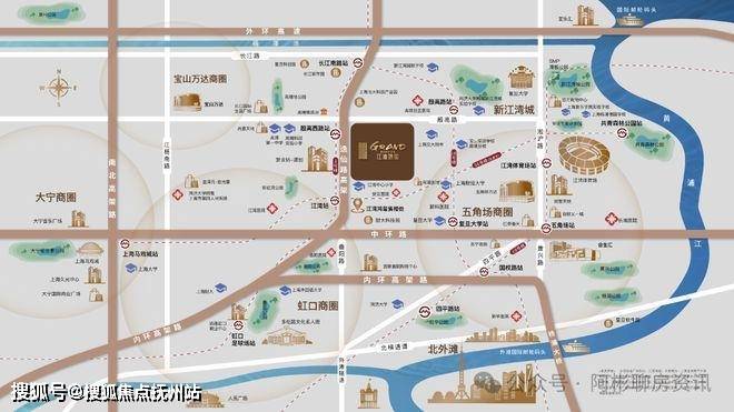 项目交通优势明显:以“三纵两横”高架路网(逸仙路高架、南北高架、淞沪路-闸殷路通道;内环、中环)实现15分钟速达五角场、大宁商圈,30分钟贯通人民广场、陆家嘴等城市核心。中环北抬规划更将强化板块与浦东、虹桥的联动,兑现“北上海门户”的战略地位。