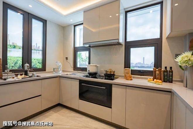 项目厨房使用方太的灶蒸烤一体机、吸油烟机三件套交付,更有弗兰卡的水槽、龙头,定制橱柜,诺贝尔的地面、墙面,石英石台面等