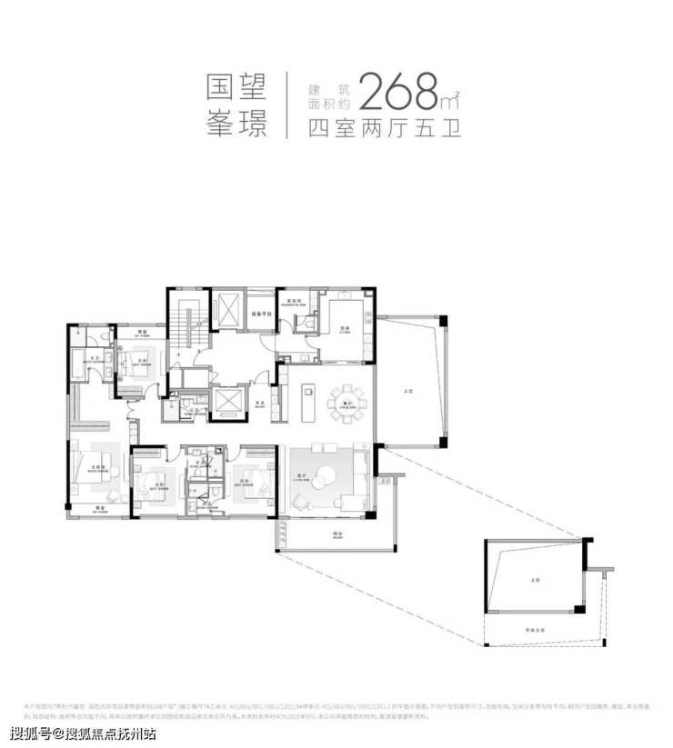 268㎡、285㎡两款户型,均是四房两厅五卫的格局。双入户动线、完全的动静分离、3个套房+挑高客厅全部朝南,是典型的“超薄户型”。