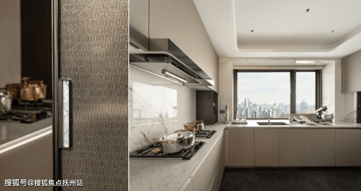 厨房内竹纹夹丝玻璃门、威乃达坡璃烤漆橱柜、与卡拉拉金大岩板台面相融,同时嘉格纳十件套满足每一种味蕾的偏好,厨房内,灶台/油烟机/洗机/冰箱(独立分体设计)五件套;向外,嘉格纳咖啡机/暖碟机/酒柜/烤箱/蒸箱等西厨五件套配置,构筑中西共融的烹饪场域。