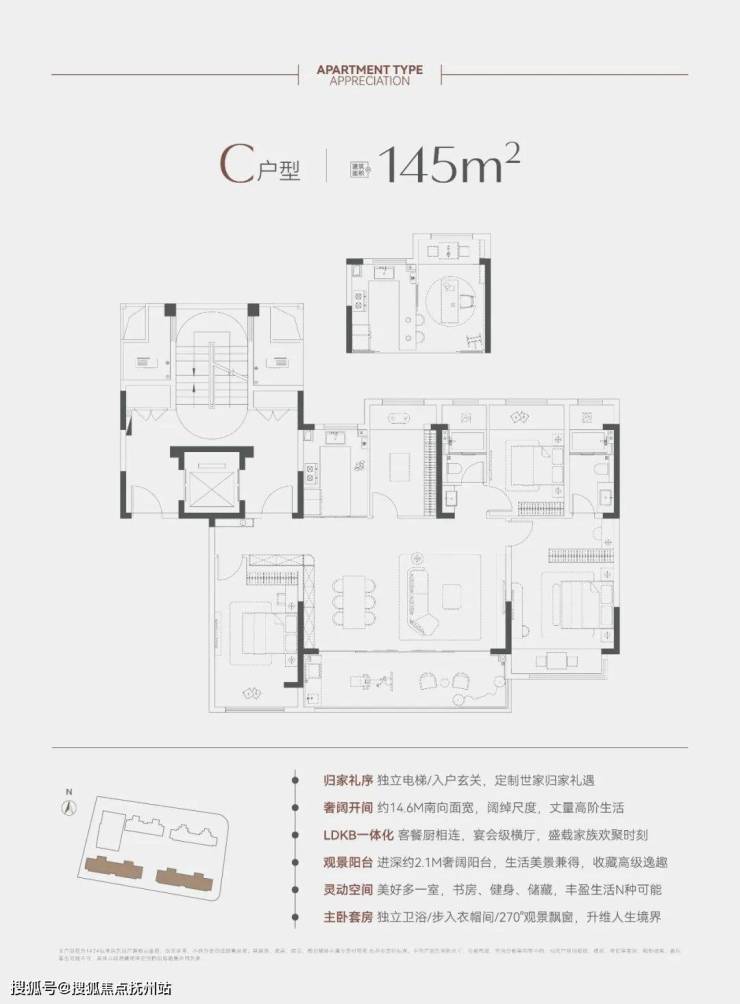 建面约145㎡4室2厅2卫:LDKB洄游动线,将客厅、餐厅、厨房、阳台等空间连成一体;四开间朝南,约14.6米南向面宽,南北通透;270°转角阳台&飘窗,视野极佳。