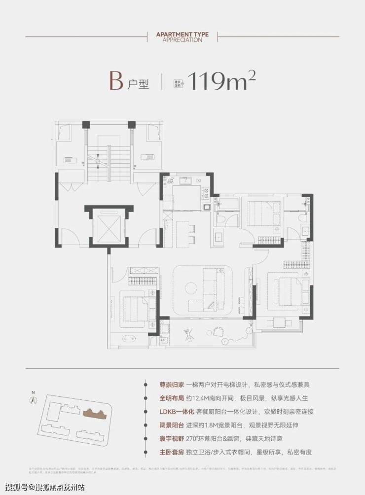 建面约119㎡3室2厅2卫:一梯一户设计,约12.4米四开间,约1.8米进深阳台,空间阔绰;主卧套房设计,独立卫浴、步入式衣帽间,提供更多收纳空间。