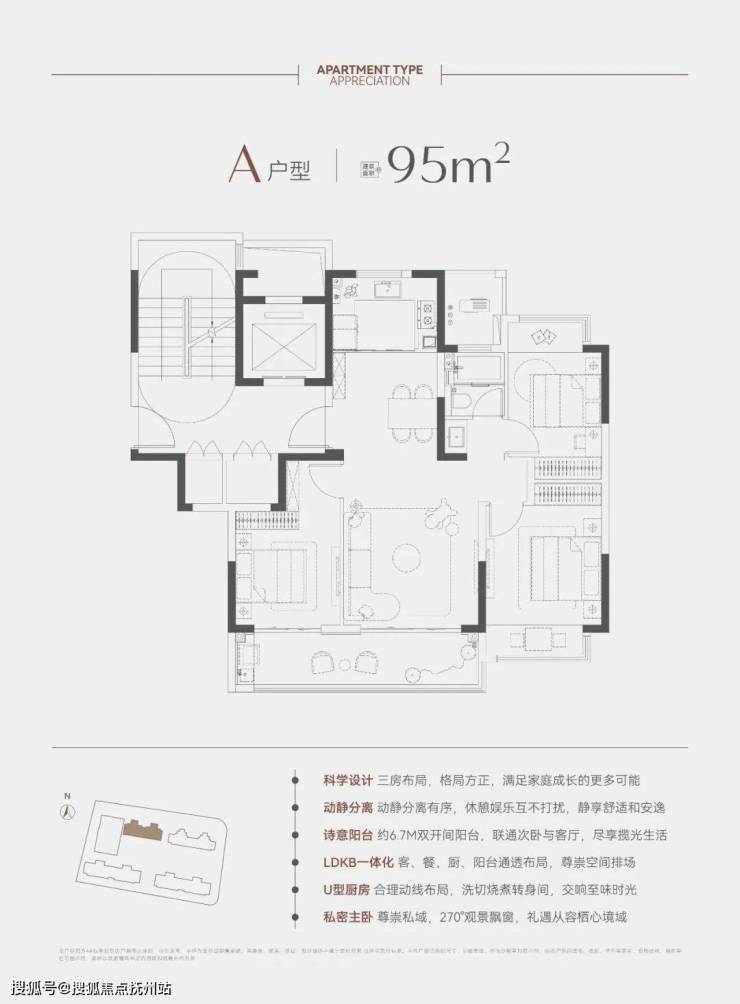 建面约95㎡3室2厅1卫:户型方正;三开间朝南,动静分离;约6.7米南向双开间阳台;LDKB一体化空间,格局通透;主卧270°观景飘窗,极大提升了采光面和视野。