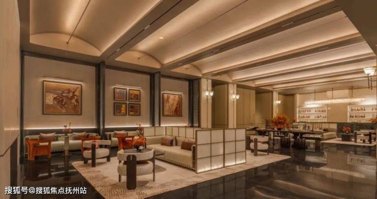 会馆内场,顶部吊灯“瑞鱼旋舞”,灵感源于苏州非遗“鱼灯”,与故宫“万寿灯”同理,寓意“生活有余、光映丰年”,也是对太湖渔文化的诗意致敬。洽谈区的金漆弧顶造型则源自苏州石拱桥,华贵中见文雅,以更富丽的形式再现江南水乡韵味。
