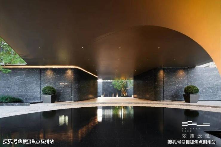 再往前走,就是翠揽云镜打造的台州首个约80米酒店式环岛门庭落客区。核心区域采用了高端酒店比较经典的纵向门廊设计,向外连接着环岛,向内串联着后场水瀑中庭和精装归家大堂,从而为业主提供了非常大气的廊下灰空间。