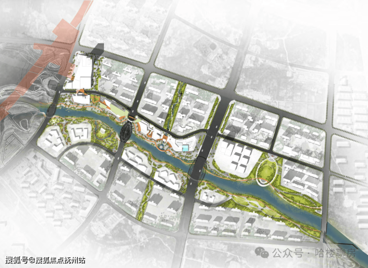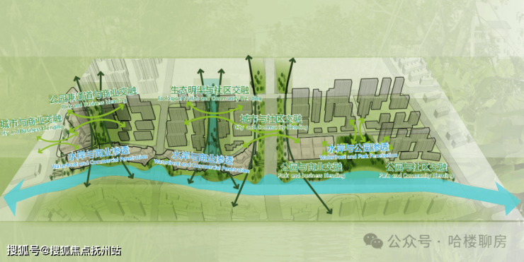 规划组成:约 44% 居住、约 1/4 城市中心商业、约 25% 城市公园群落