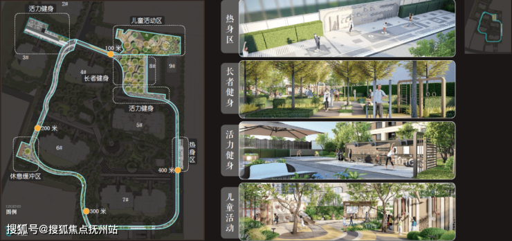 五大运动活力系统:热身区、定制主题儿童活动区、老年健身区、活力健身区和休憩缓冲区,并由约400M跑道串联;