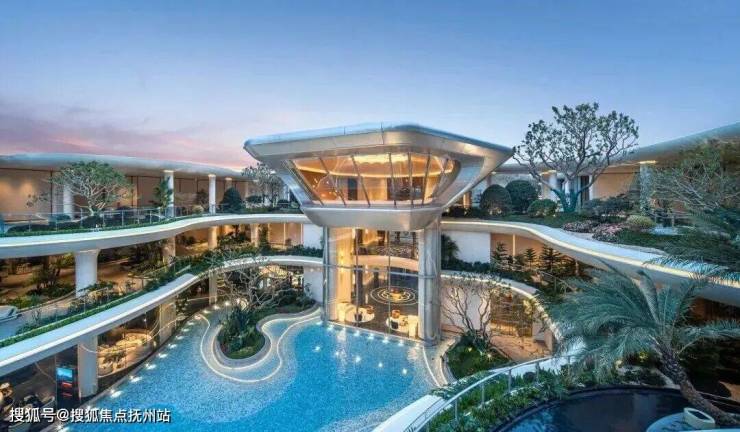 凭借约16米高差,营造穿行山水的沉浸式体验。以“两轴三庭”布局,园区中间水系面积超2500方,俯拾可见的瀑布、泳池,热带植物丛簇,犹如顶奢度假酒店。
