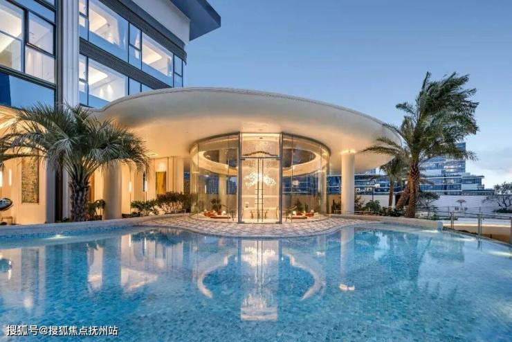 不止于此,元序还花费重金做到奢石满配:中央车马厅层墙面局部采用雪花白奢石,池壁为巴西利亚黑奢石,池底铺进口黑金砂,溢水台面选用“绿野仙踪”奢石,大堂月光米黄石材,有些地面铺上了太古黑金石材,蓝水晶石材背景墙…