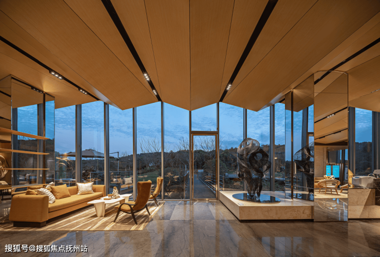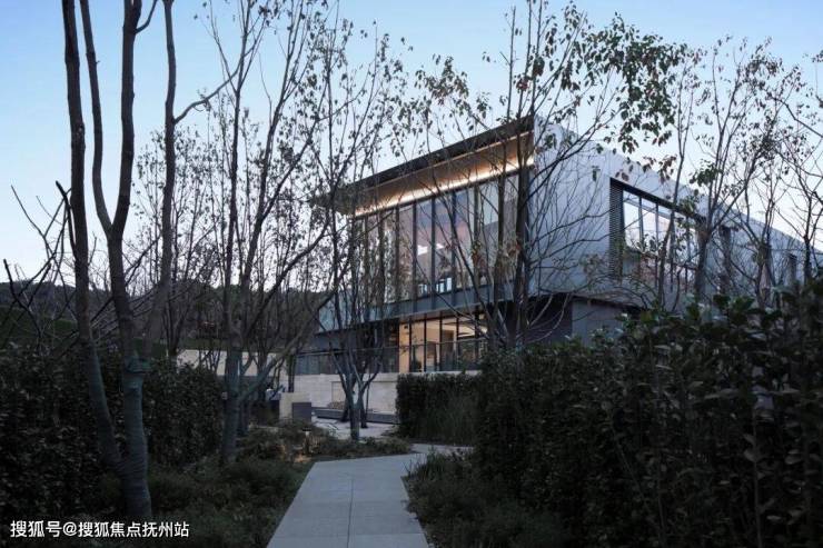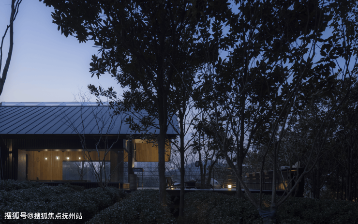 底层敦实的基座将建筑与山体融为一体,二层横向连续的玻璃幕墙面朝茶田徐徐展开,餐桌、吧台面对如此美景,假象一下:未来的社区,暮色四合,宵夜开席,岂不美哉?
