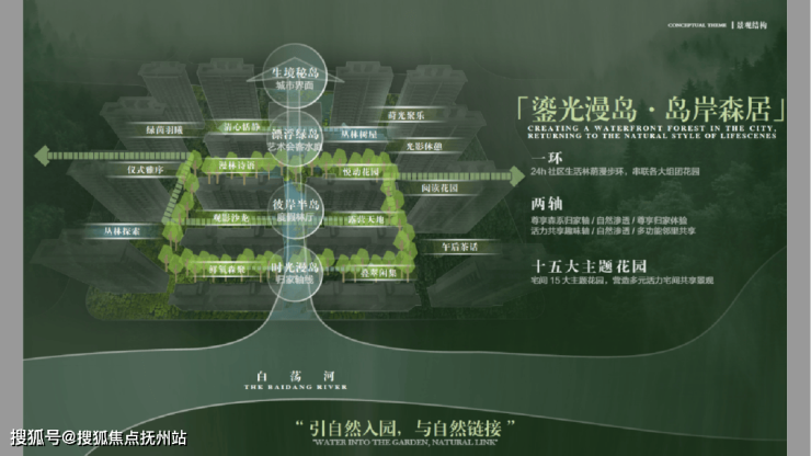 整个社区内,项目规划“一环两轴十五园”景观布局,将水岸、岛屿、森林、花园、树屋作为园林节点,营造出沉浸式山水活力场域。