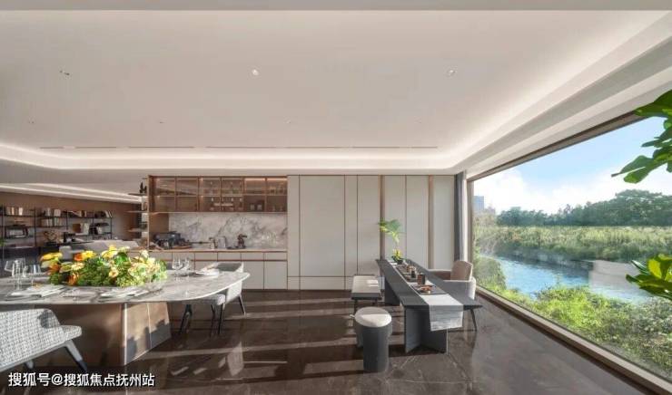 会所级社交观景餐厅,胜在“一镜到底”,茶室、餐厅、厨房自成一体,坐落其中,对望湖景或园景、城景,是景观最大化的另一种表述。