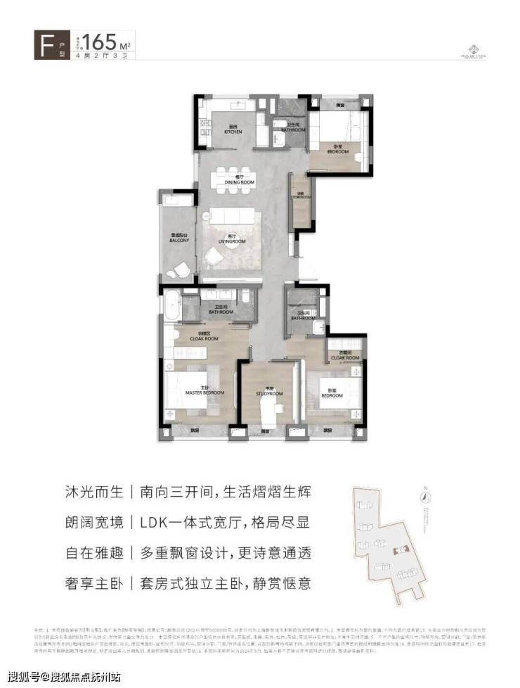 建面约165㎡的4房2厅3卫户型,南向三开间进一步扩大,LDK一体化、多重飘窗设计,为生活延展出更多可能。整体户型设计注重空间的合理利用和居住的舒适性,满足了不同家庭结构和生活需求的购房者。