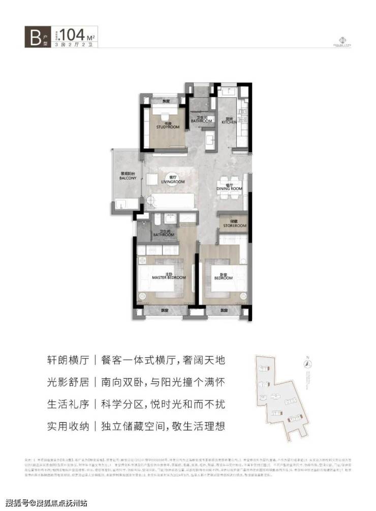 建面约104㎡的3房2厅2卫户型,客厅、餐厅、阳台一线贯通,视野开阔;