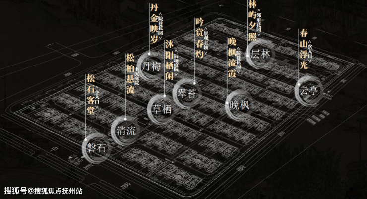 8大景观节点:营造可行、可观、可游、可居的东方诗意天地。①松石客堂-主入口;②松桕悬流-下沉庭院;③沐阳栖闲-后场庭院;④吟赏春灼-景观主轴;⑤丹金映岁-院巷花园;⑥晚枫流霞-院巷花园;⑦林屿夕照-邻里花园;⑧春山浮光-次入口