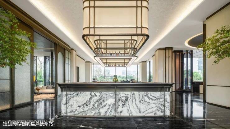伫立首层大堂入口,抬眼是底部透光的悬挑式空中泳池,俯首是下沉庭院水景。飨湖私宴厅、饮湖茶室等,亦与水岸、空中旋梯景致交融。