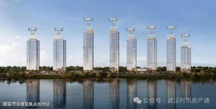 项目整体规划8栋住宅,层高23-31F,共449户,车位配比约1:1.23,容积率约2.14,开发商自有物业。1号楼为23F,2/6号楼为31F,3/5/8/9号楼为29F,7号楼为30F。楼栋均是北向面江一字排开,是真正的一线临江住宅。