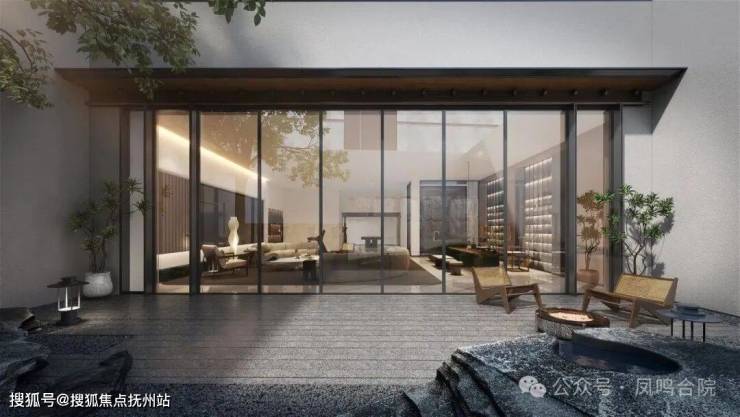 与传统中式的小窗设计不同,凤鸣合院采用更大的落地窗,引光入室、纳景于窗,大幅提升室内采光与视野。这种设计让建筑外观既细腻温润又具现代通透感,仿佛从宋代画卷中走出,又适配当下生活。