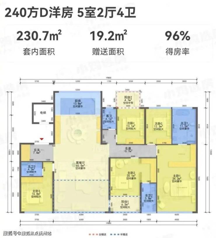 因为天珺是建筑新规后的作品,所以在飘窗,阳台,设备平台等方面有了更大的空间,也得到了更高得房率,像建面约220㎡的高层,得房率就接近92%。所有户型都是南厅设计。