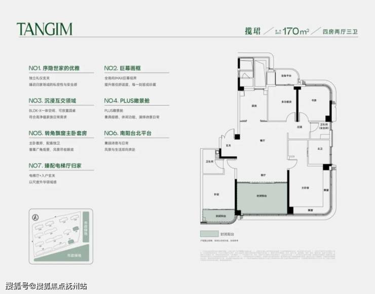 类一梯一户设计,独立玄关;类四叶草户型,空间互不干扰;南向户型整体面宽约12.7米,采光充沛;主卧270度转角飘窗,L型全景采光面;客厅阳台封闭后仍保留多阳台&设备平台,兼顾观景与实用晾晒。