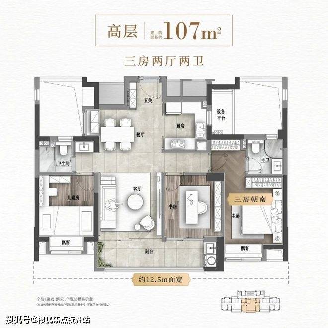 如果选择三房,约12.5米的南向超大面宽,可以实现三房都朝南的格局。