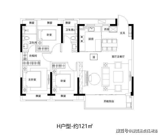 三开间朝南,客餐厅连通大阳台,四飘窗设计,L型厨房转角移门设计,最大化空间视野