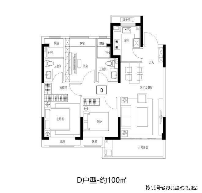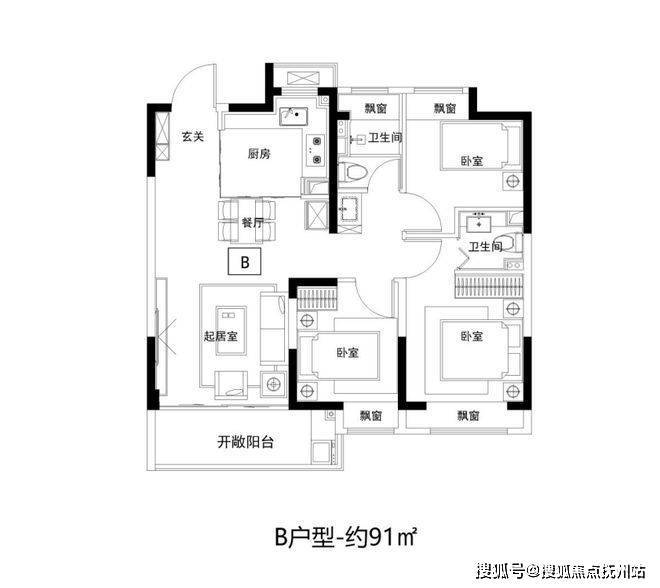 该户型上车门槛低,2房朝南大面宽和全卧飘窗设计。