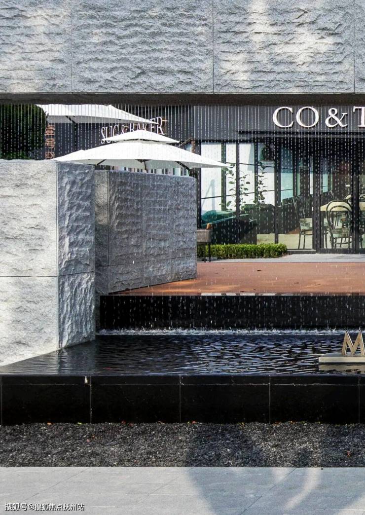 设计取台州七山一水二分田的自然风貌凝练于景观空间的设计中,取山海之意与设计相融。在场域分界处,以留白的山峦写意与水帘流瀑演绎山水飞鸿之势,从而突出明朗、清澈的第一印象与整体感受,塑造手法强调文脉的延续性,将台州独特的地缘特征纳入设计理念之中。