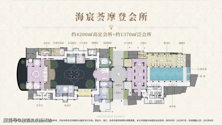 约4200㎡摩登会所 +约1370㎡泛会所空间。整体面积超5500㎡,比起市面上总价四五千万起步的顶豪还要丰富。会所包含恒温泳池、健身房、双私宴厅、影音室、品茗室等十大功能空间。