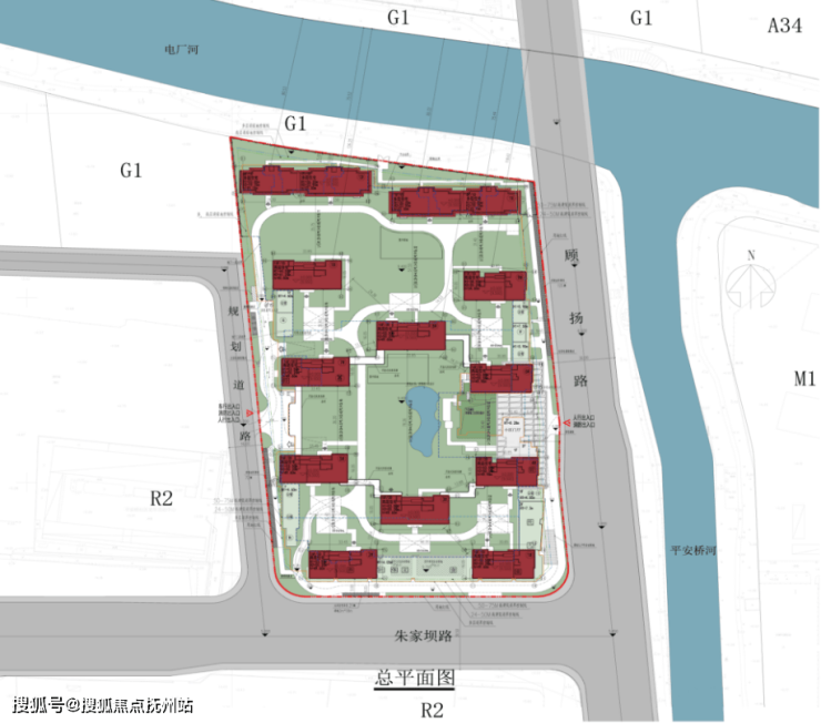 其中洋房位于项目的北面,享受一线电厂河道景观,整体南高北低分布。项目的出入口位于东面的顾杨路和西面的规划道路。其中东面的主要出入口位置坐了小区门厅、景观构架、下沉式庭院和景观水系,详细的方案效果待二次深化。
