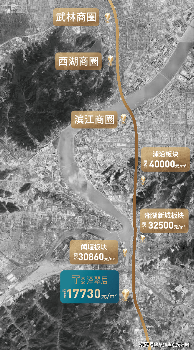 「主城生活圈」内,精装限价却只要17730元/㎡。 不过几脚油门,购房成本就可以省出5万/㎡+。沿途的浦沿40000元/㎡、湘湖新城32500元/㎡,单限价就比戴村贵1.8-2.3倍。总价算下来还要高出一大截。