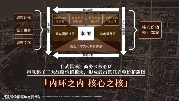 项目据守武昌滨江极核,私享两隧三横之间城市顶级资源精粹,左擎右书,江山入画,包揽总部商务之最、商业密度之最、配套兑现之最、生活浓度之最。