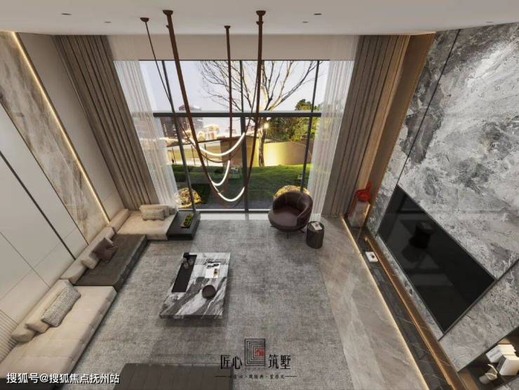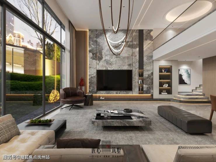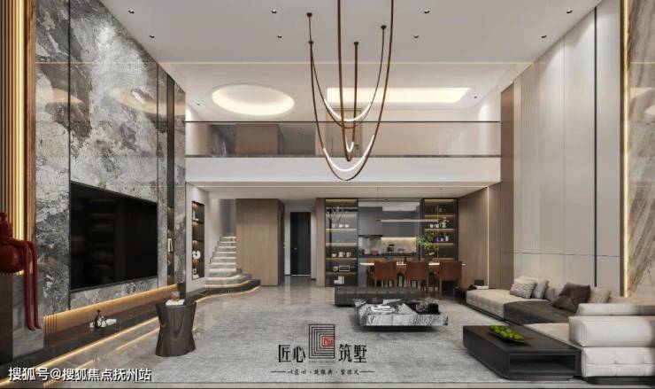 客厅设计整体以现代风格为主,采用大理石木饰面和硬包为主,展现出一种高端大气的美感。这里不仅是休闲娱乐的场所,更是主人放松身心的理想之地。让人仿佛置身于一个充满艺术气息的私人空间,尽享舒适与惬意。