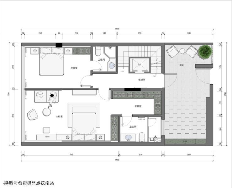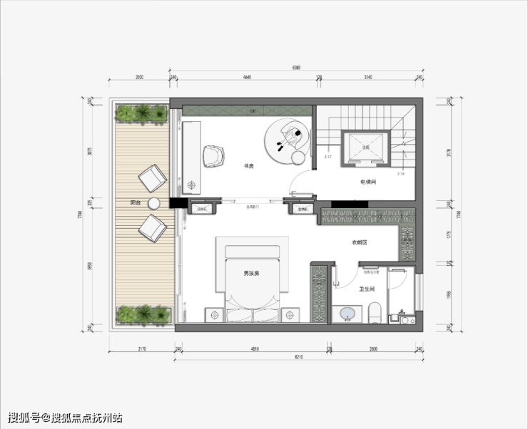 二楼为男孩专属空间,包括书房、卧室、卫生间和露台,相互结合布局雅致且功能齐全。