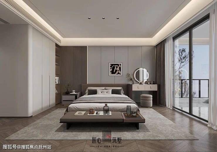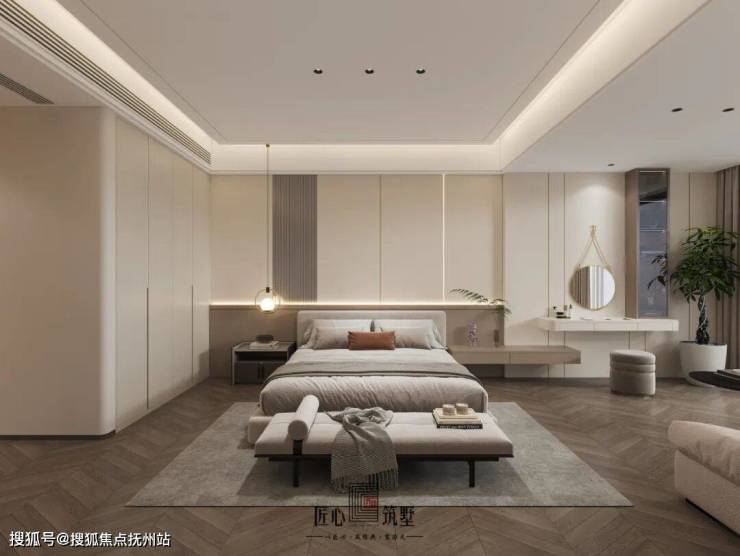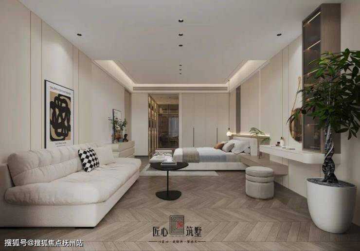 主卧以现代风格为主,以白色硬包加木饰面点缀, 主卧内有沙发休息区,使得主卧焕发出了一种时尚、优雅的现代美感,令人陶醉其中。