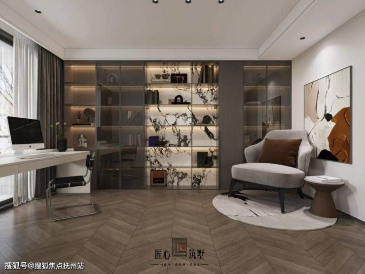 男孩房的设计风格以现代简约为主,巧妙地融入了木饰面和大理石的点缀,使得整个空间既大气又不失温馨。书房为业主提供了学习和休闲区域。+