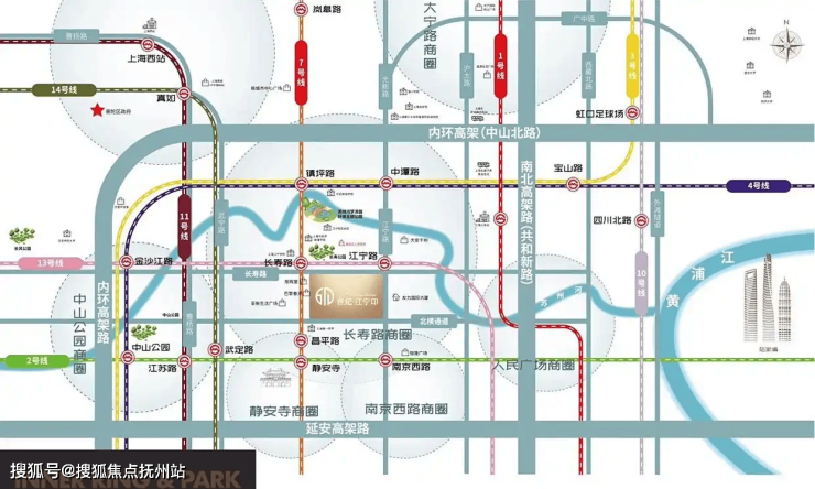 项目位于普陀区内环内长寿路商圈,毗邻静安寺、南京西路等核心商圈(车程10分钟内),属苏州河"苏河之冠"中央活力区。