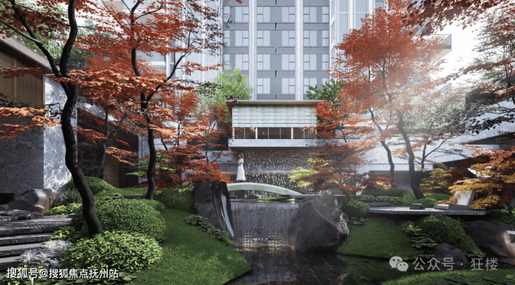 奢礼归家:借鉴苏州园林礼序,规划约500㎡社区门庭,以约10米高双瀑环抱,玉阶浮桥,营造步步尊崇、层层递进的归家礼序,营造出“结庐在人境,而无车马喧”的静谧氛围。