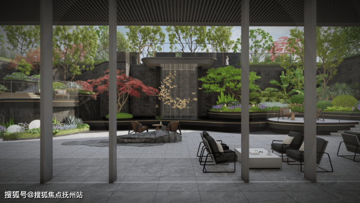 园林水景潺潺流淌,与上下相连的艺术雕塑相映成趣,仿佛蝴蝶翩跹于林间,成为视觉的焦点。巧妙利用高差打造的休闲观景平台,或俯瞰水景与雕塑的交融,或平视绿意盎然的庭院景观,每一步都是一场视觉与心灵的盛宴。