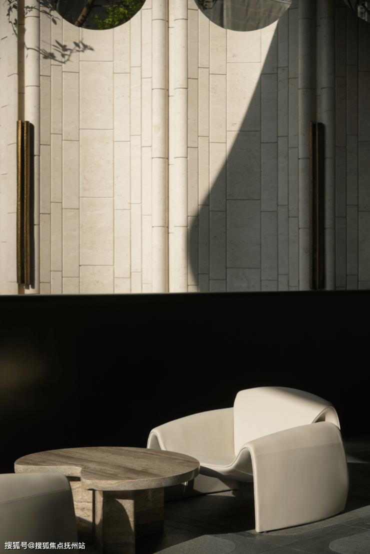 入口昭示 面的黄铜饰面与石材柔美曲线,以轻奢材质和流动形态弱化城市硬边界,形成昭示性极强的“城市橱窗”。