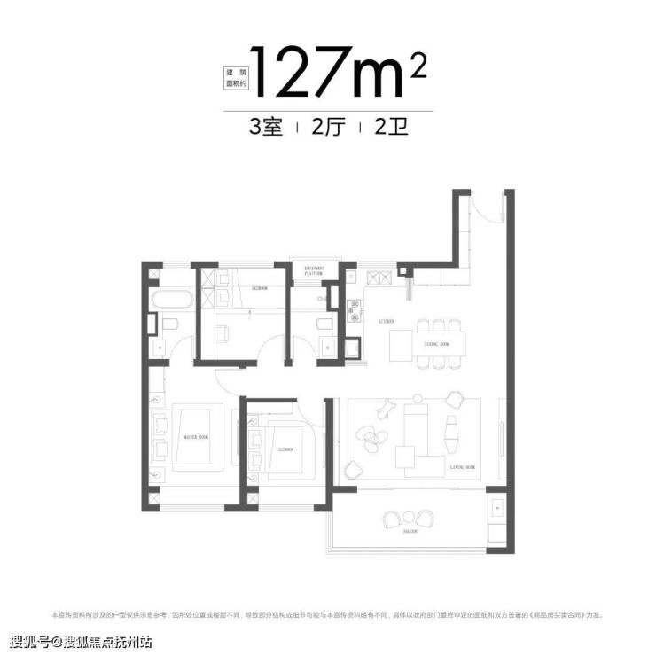 主卧带有内卫,且设计了浴缸,南次卧带独立衣帽间;