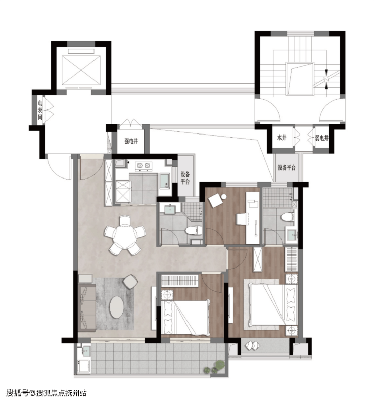 建面约89㎡B 户型,不仅做到三房两厅两卫,而且南向三开间还有双联阳台,尺度约6.3m。