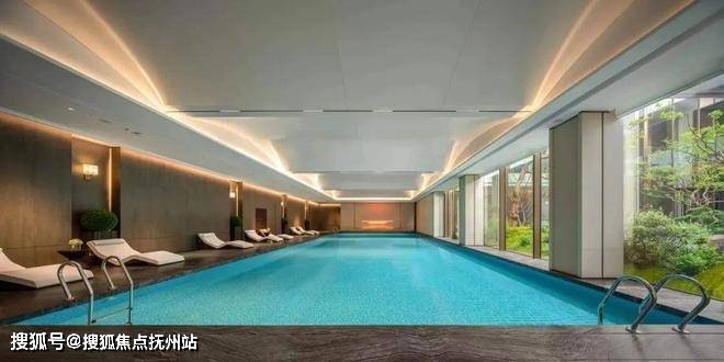 恒温泳池,是以度假酒店为灵感设计的,通透的落地玻璃窗下与下沉庭院景观相互渗透,实现一年四季畅游的“游泳自由”。
