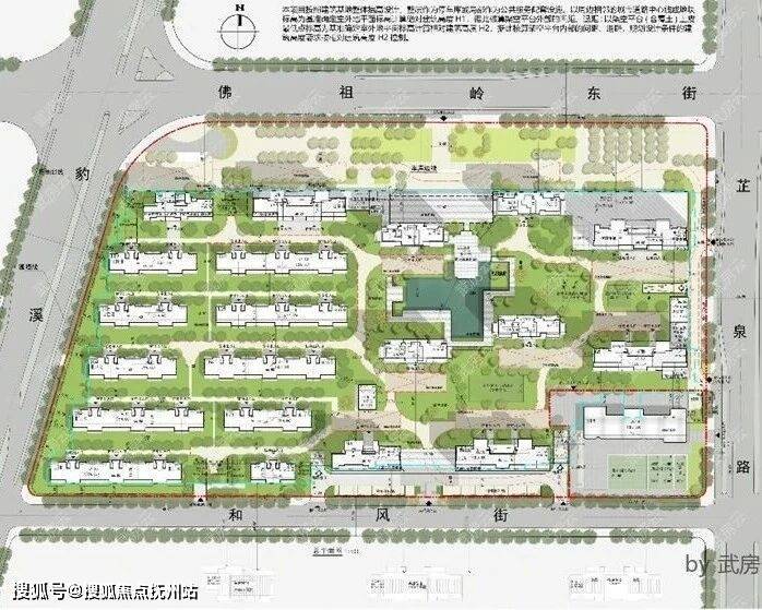 从平面图来看,该项目地块比较规整,四至均为道路,所有住宅楼栋均为南北朝向。主入口位于北侧1、2号楼之间,菜市场位于东北角。小区与佛祖岭东街之间规划了宽约35米的绿化隔离带。