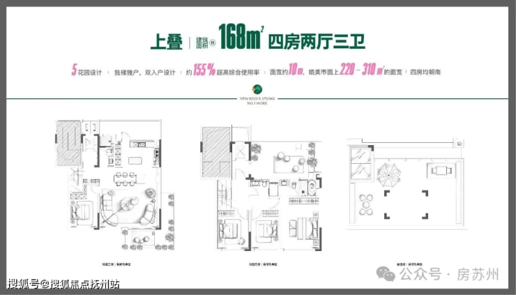 两款户型,建面约168/188㎡,均是独梯独户+双入户设计+约10米大面宽+约155%得房率的神户型!其中上叠更是实现了“5花园设计”!