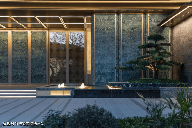 景致先迎,匠造于微。入口88m超横屏月映绮门,以范思哲黑、普拉达绿等石材为基底。两侧甄选造型罗汉松与名贵乔木,以 “错落式定位” 分层排布 ,强化空间纵深感。整体对称布局,让居者在归家瞬间,感受到现代奢宅的仪式感与东方美学的文化根脉。