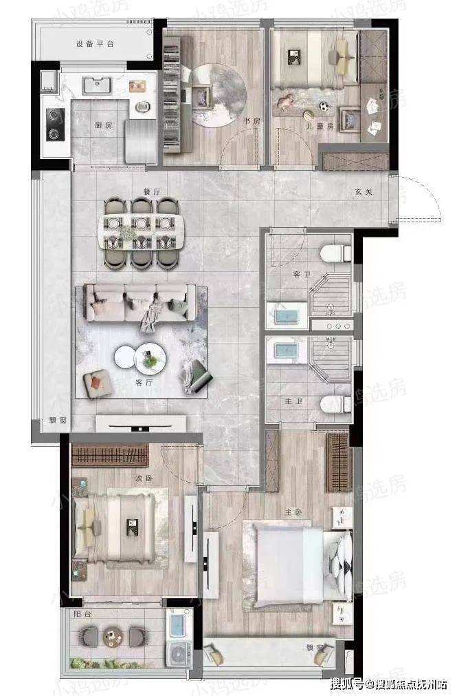 建筑面积约130方的户型,设计出了双飘窗、双阳台,产品力爆棚。南向家政阳台方便晾晒,东侧270°可观景阳台,满足休闲娱乐需求,功能划分明晰;建筑面积约18.6㎡的主卧是套房设计,空间阔绰,生活舒适感更强。