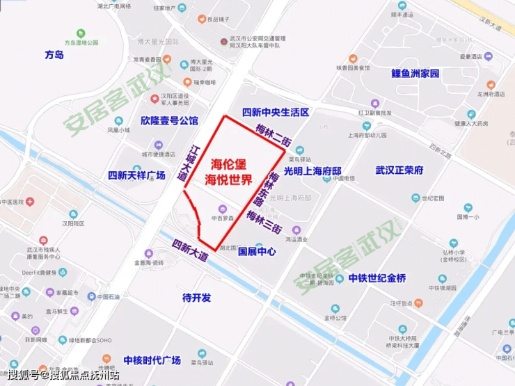 北面是四新中央生活区,南面紧邻四新大道,再南面为待开发地块以及中核时代广场,西面为四新天祥广场、欣隆壹号公馆,东面为光明上海府邸、国展中心。