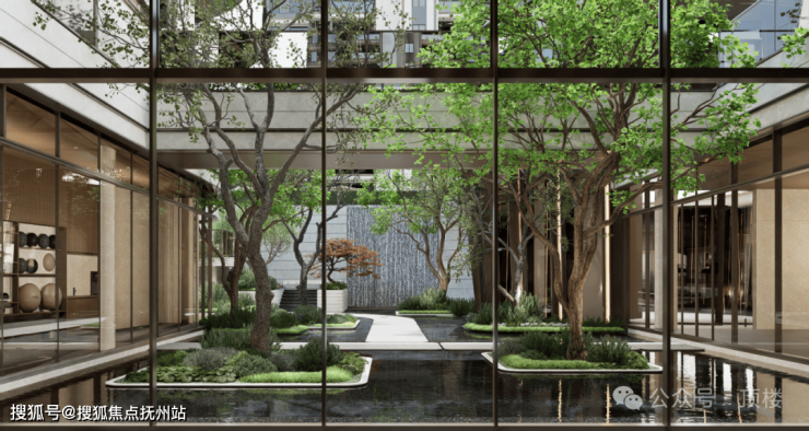 •以“云台”艺术花池串联空间层次,拾级而上,可观细节精工,可驻平台赏景。自上而下的水瀑,贯通上下空间,配合舒展的植物、潺潺水声与轻盈汀步,共同叙写空间的静谧与纯粹。