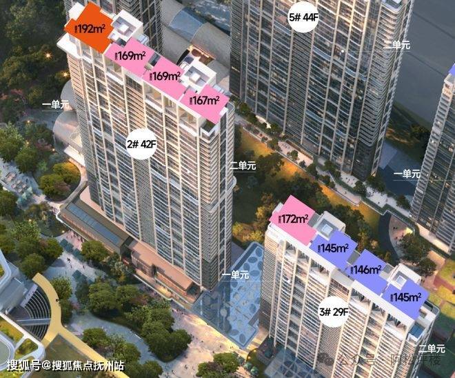 2号楼共42层,3号楼共29层,均为2个单元,2梯2户设计,包含建面约145平-192平房源。